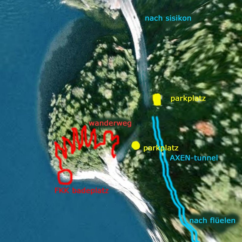 zufahrt von flüelen -> sisikon: PP gelbes rechteck nutzen. gleich nach dem axentunnel (2.tunnel) rechts. kein wenden möglich, doppelte sicherheitslinie!